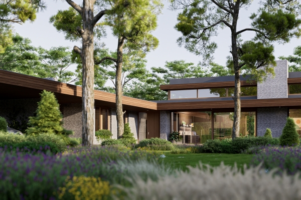 Přízemní rodinný dům do rovinaté krajiny jižní Moravy inspirovaný americkou architekturou 2. poloviny 20. století.