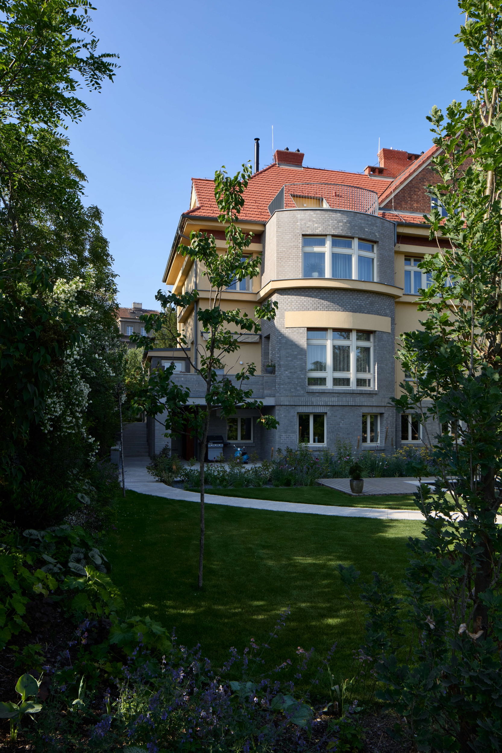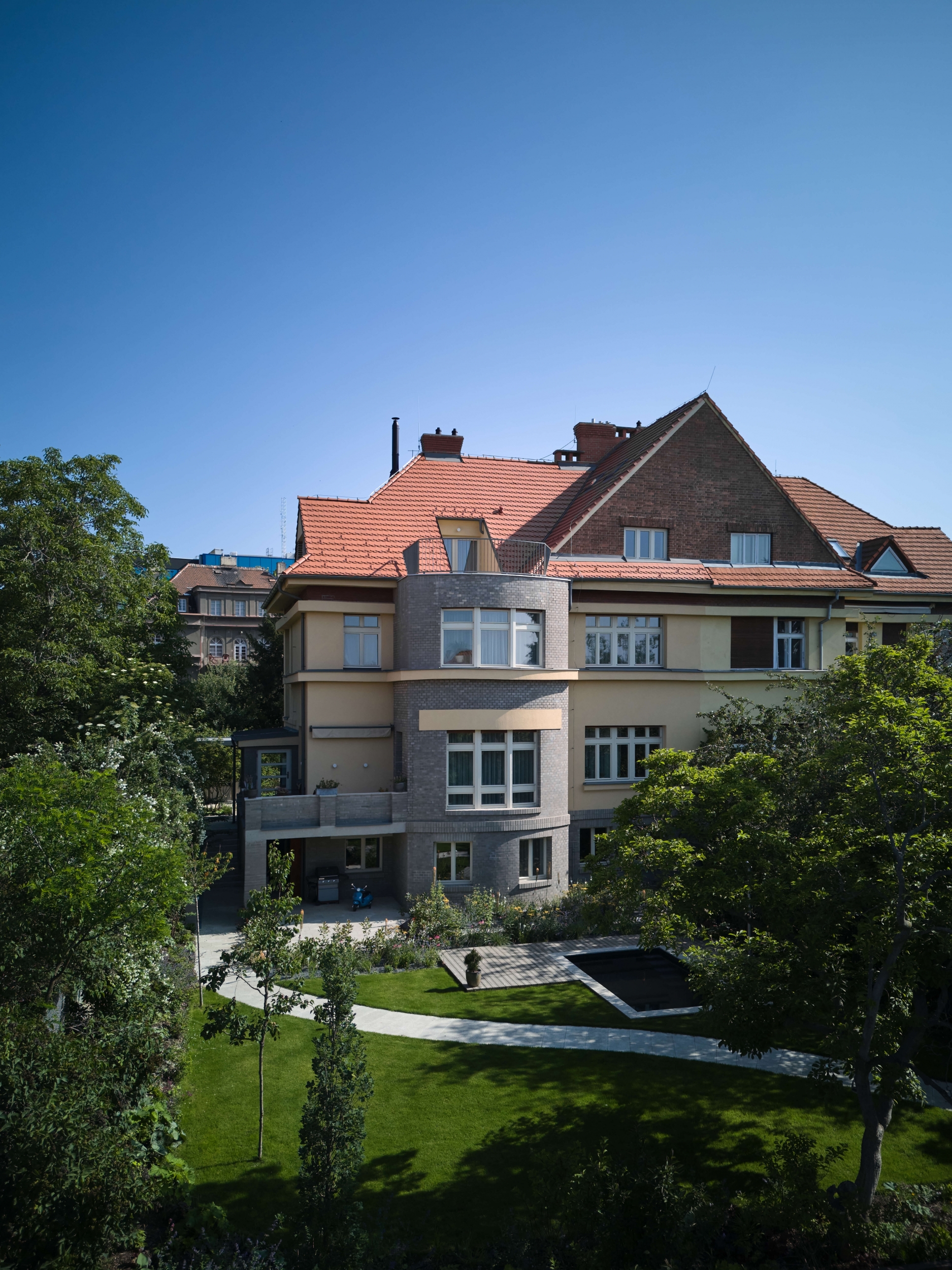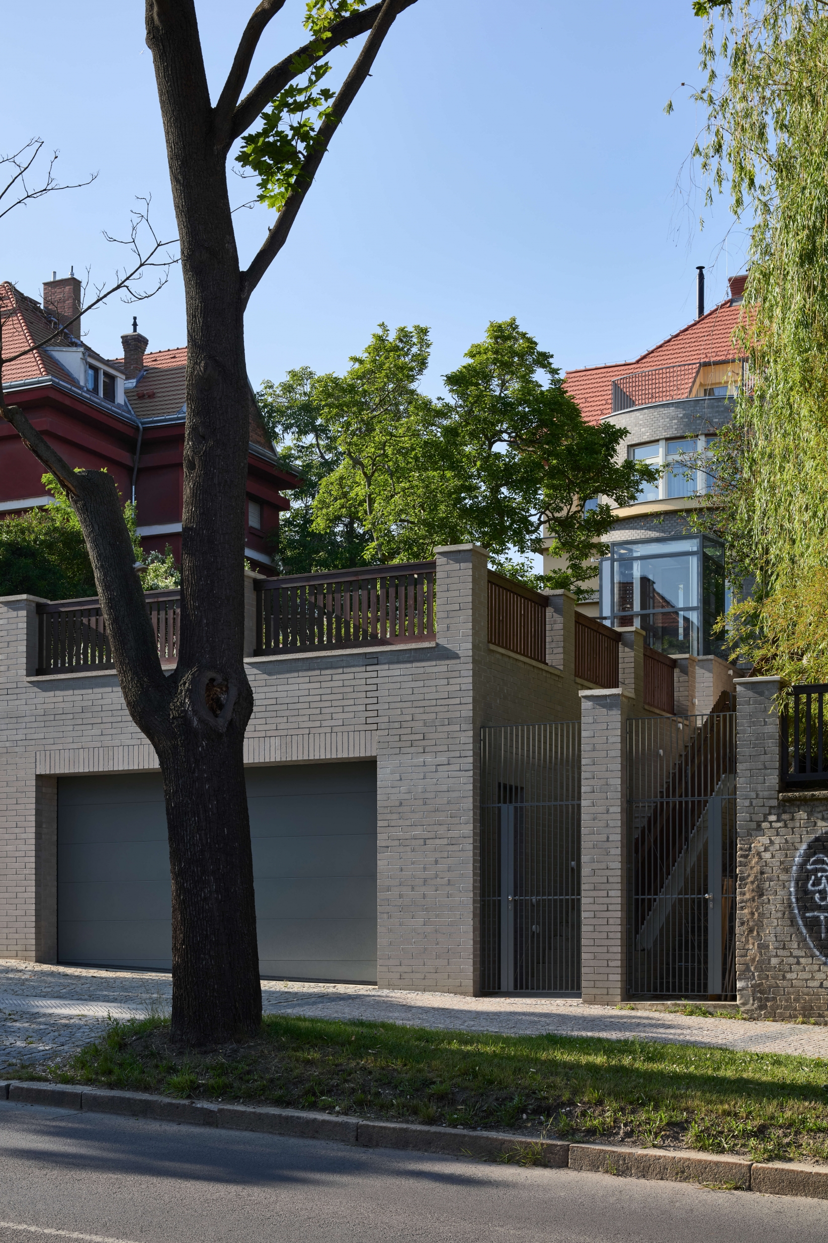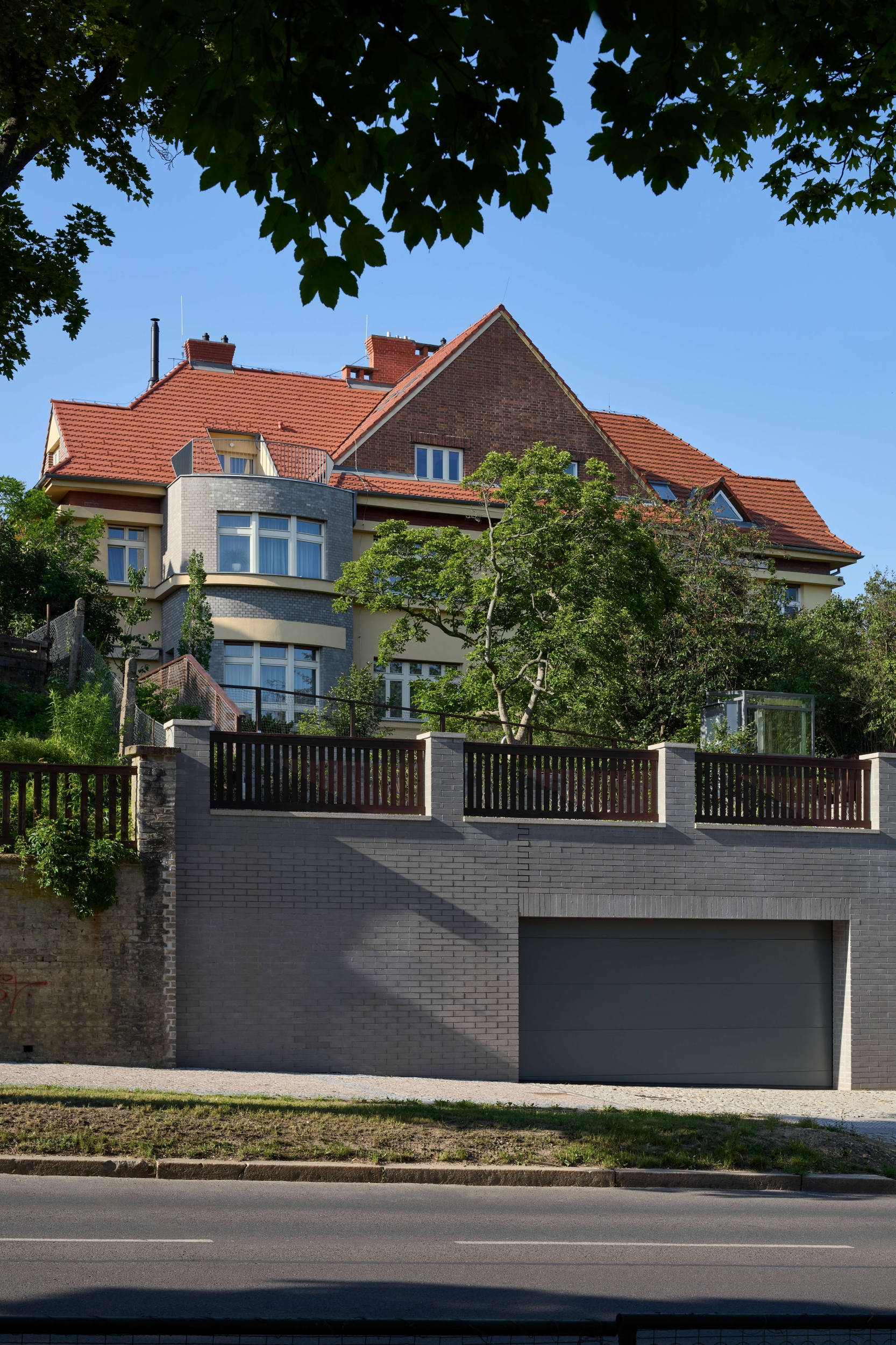Rekonstrukce se zaměřuje na obnovu exteriéru, kde je zachován původní charakter fasády s pohledovými betonovými cihlami v suterénu a břízolitovou omítkou ve vyšších podlažích. Součástí projektu je také novostavba garáže. Původní garážové stání, které bylo staticky a technicky nevyhovující, bylo zbouráno a nahrazeno novým podzemním objektem. Tato nová garáž nabízí tři parkovací místa a její střecha je upravena jako pochozí zelená plocha, která rozšiřuje prostor zahrady.