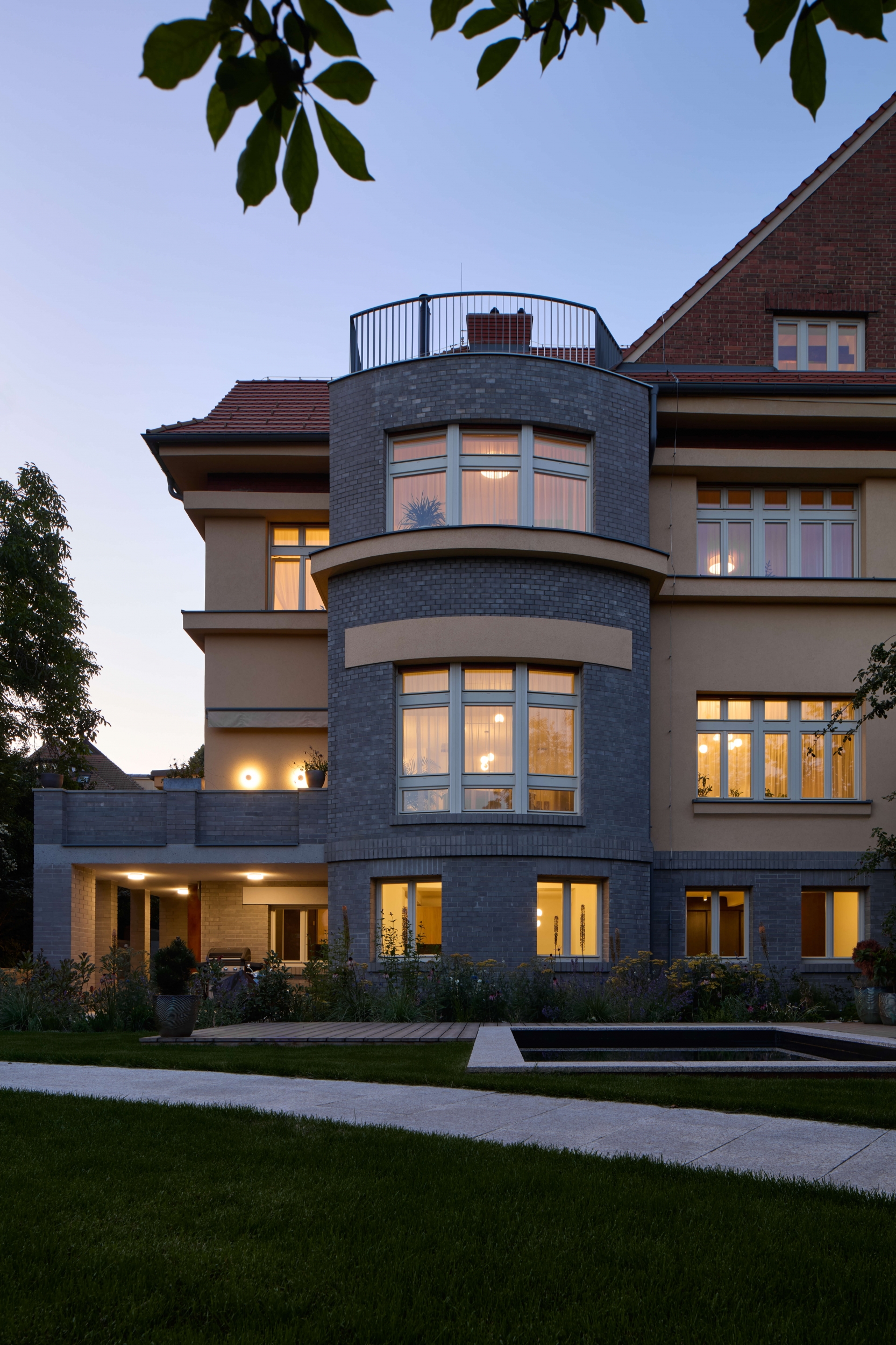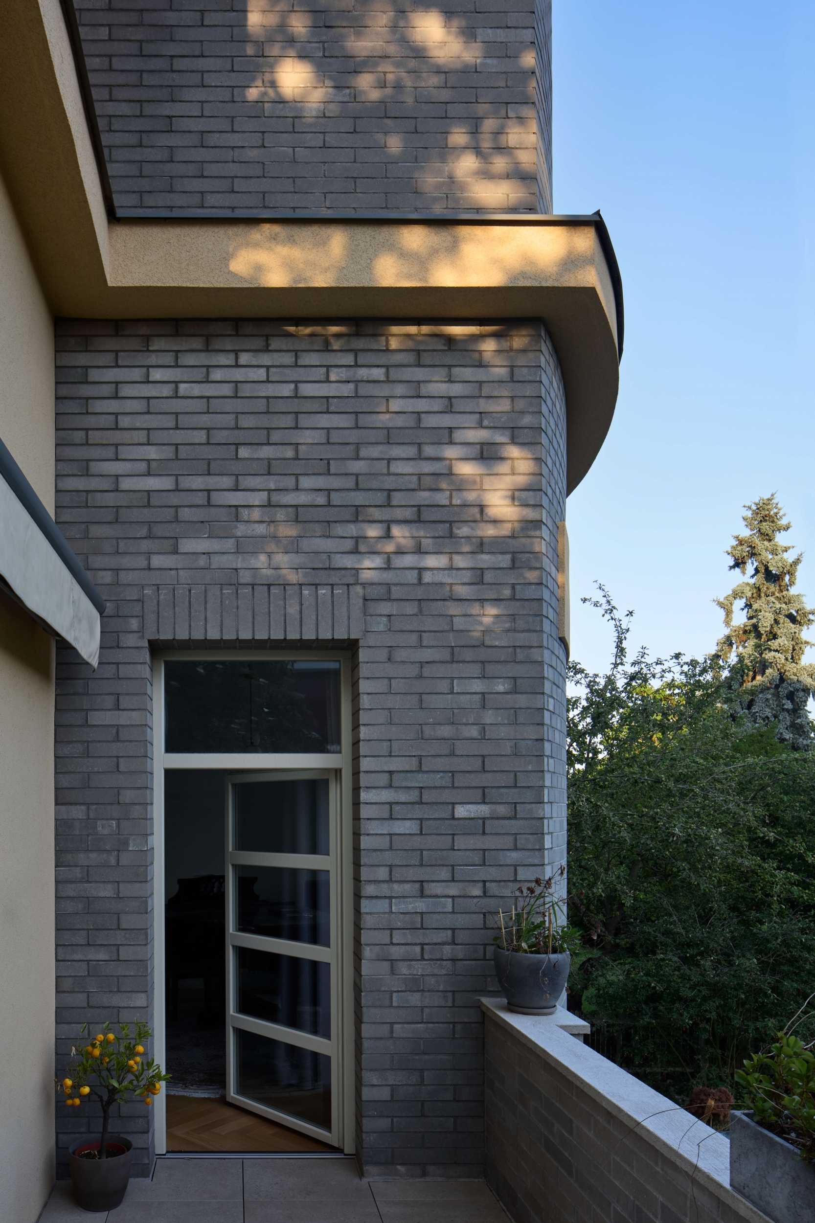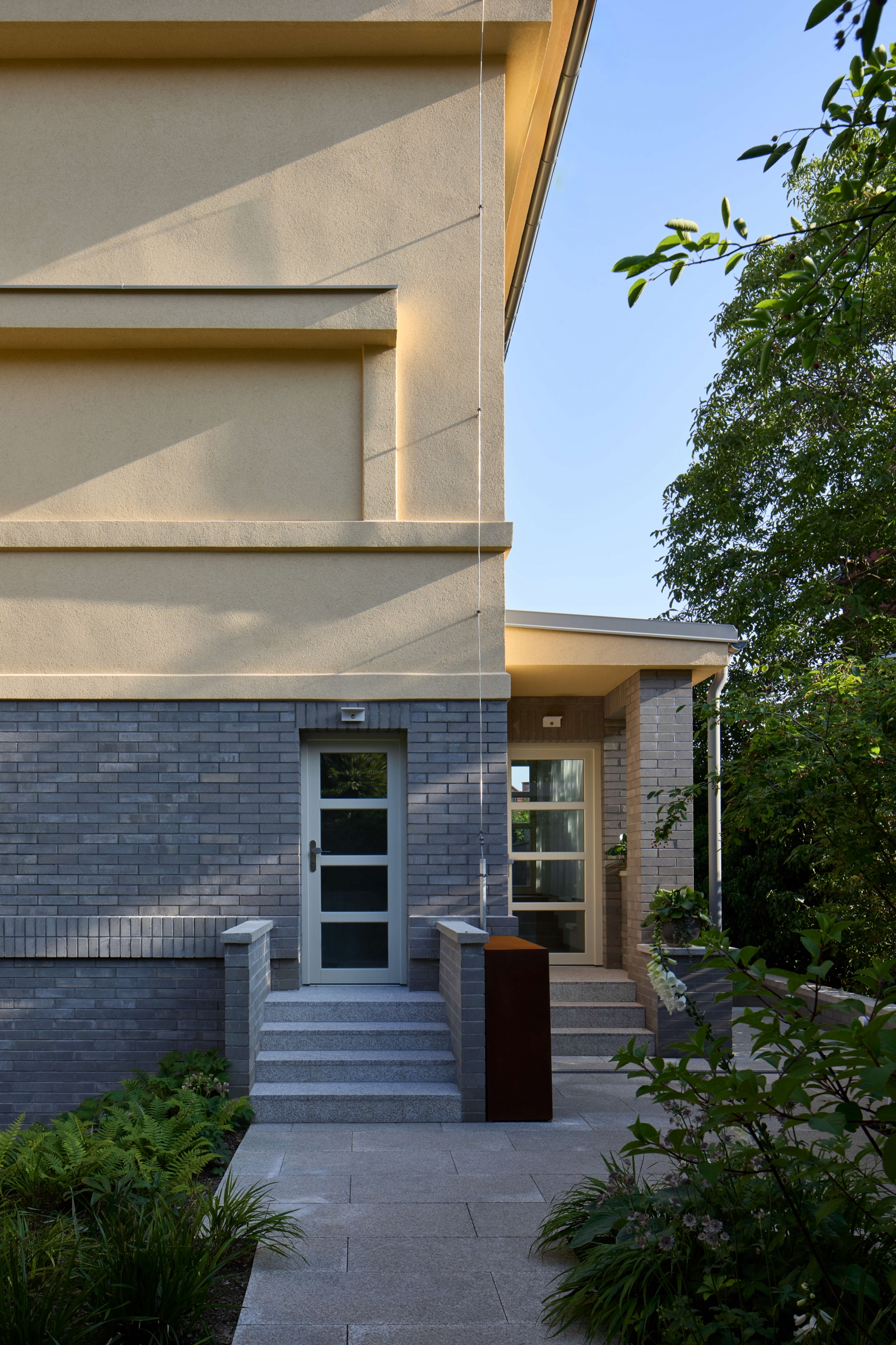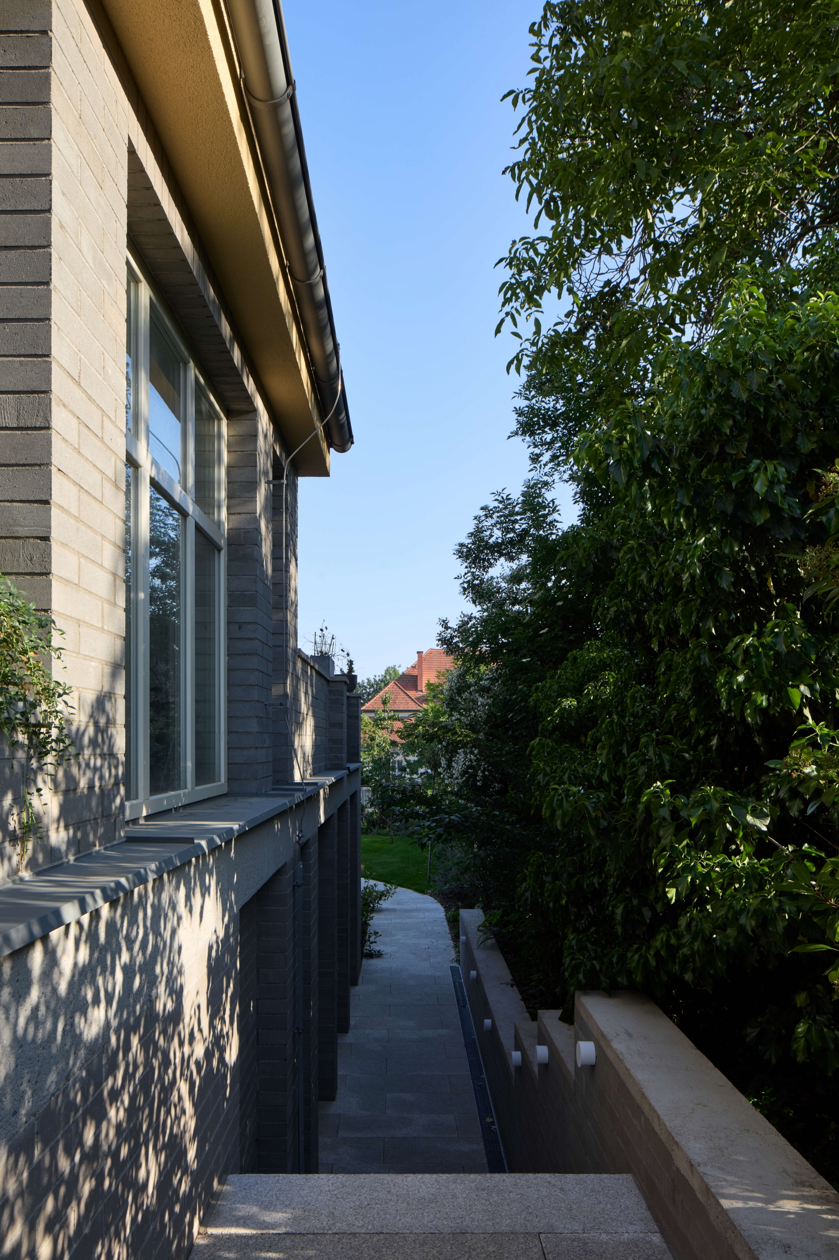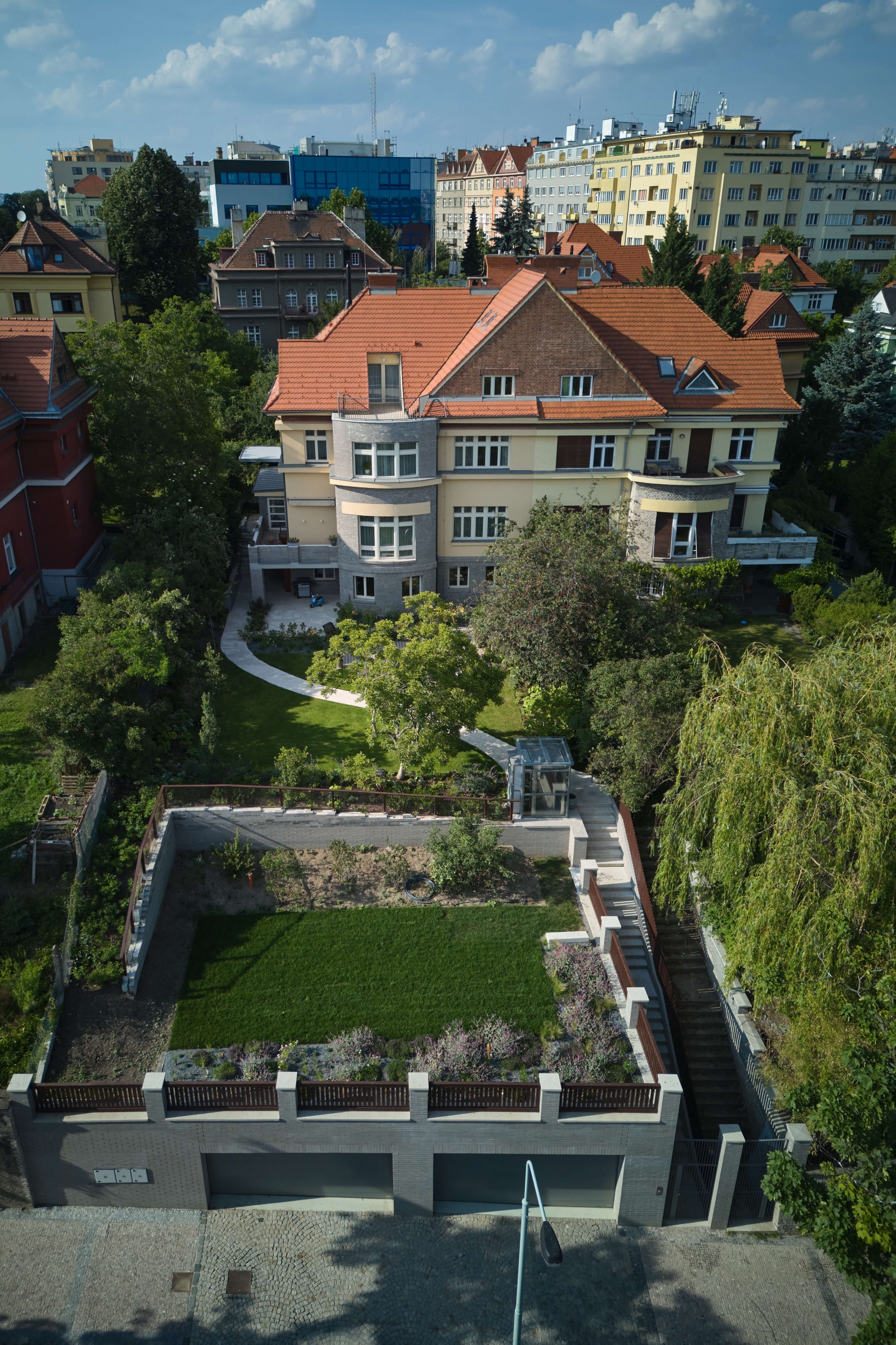 Rekonstrukce se zaměřuje na obnovu exteriéru, kde je zachován původní charakter fasády s pohledovými betonovými cihlami v suterénu a břízolitovou omítkou ve vyšších podlažích. Součástí projektu je také novostavba garáže. Původní garážové stání, které bylo staticky a technicky nevyhovující, bylo zbouráno a nahrazeno novým podzemním objektem. Tato nová garáž nabízí tři parkovací místa a její střecha je upravena jako pochozí zelená plocha, která rozšiřuje prostor zahrady.