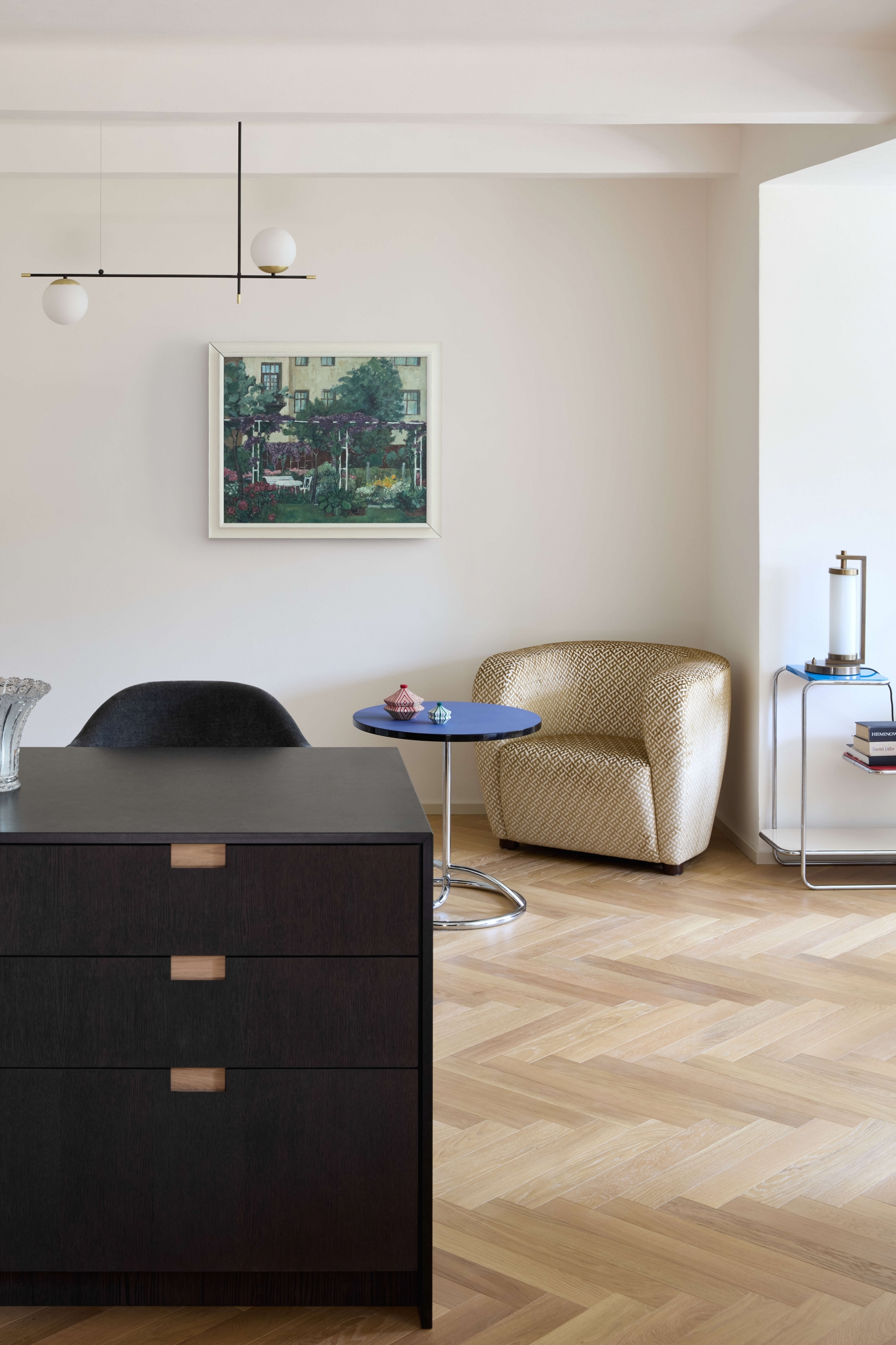 Interiérové úpravy spočívají v rozdělení vily na tři samostatné bytové jednotky. Jedna jednotka je v suterénu (1. PP) s přístupem na terasu a s nově vybudovaným anglickým dvorkem pro lepší osvětlení. Druhá jednotka je mezonetová, umístěná v 1. a 2. NP, a třetí se nachází v podkroví, s vlastní terasou. Všechny nové konstrukce, jako například stropy a příčky, jsou řešeny s ohledem na statiku a akustiku.