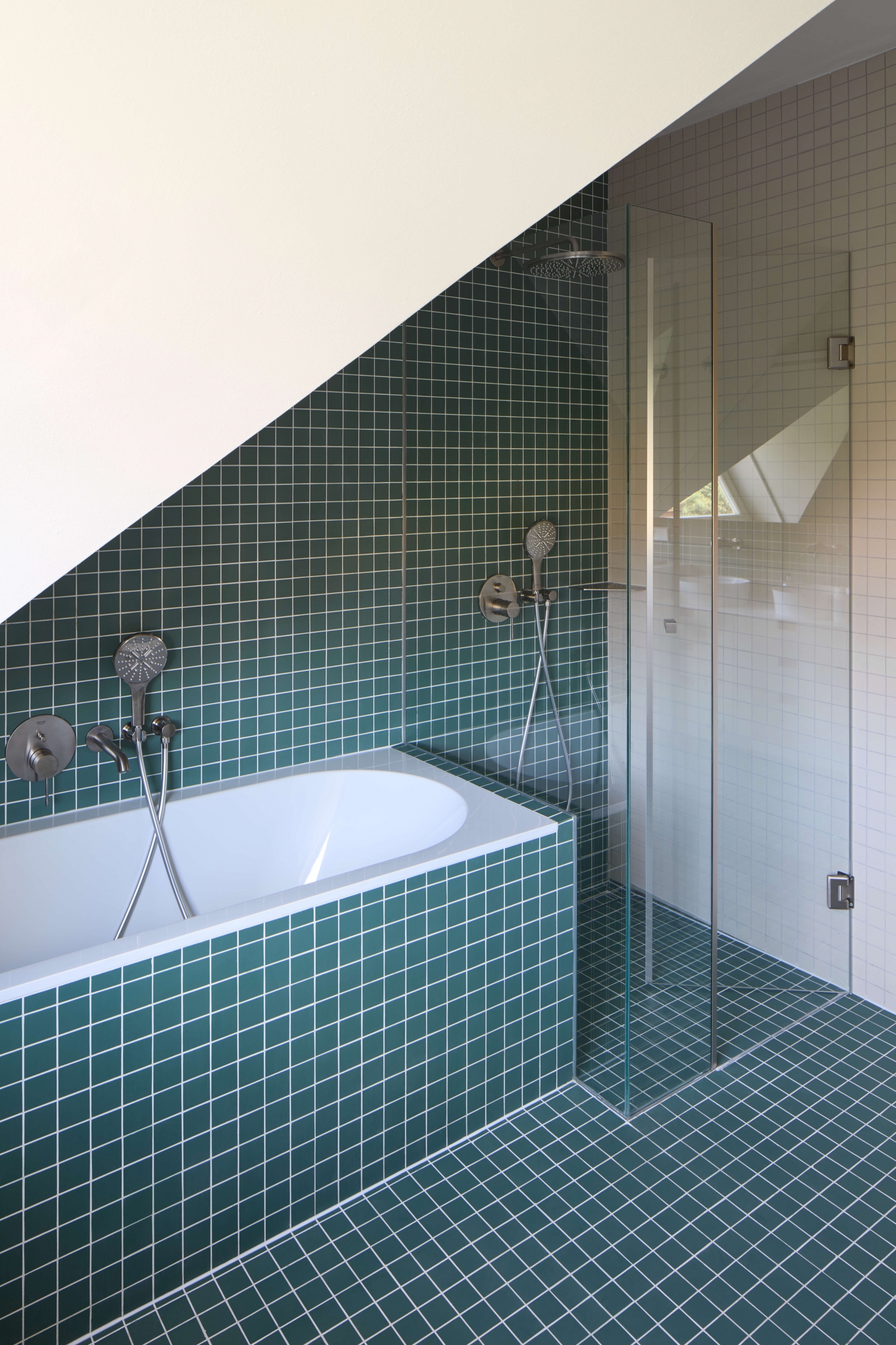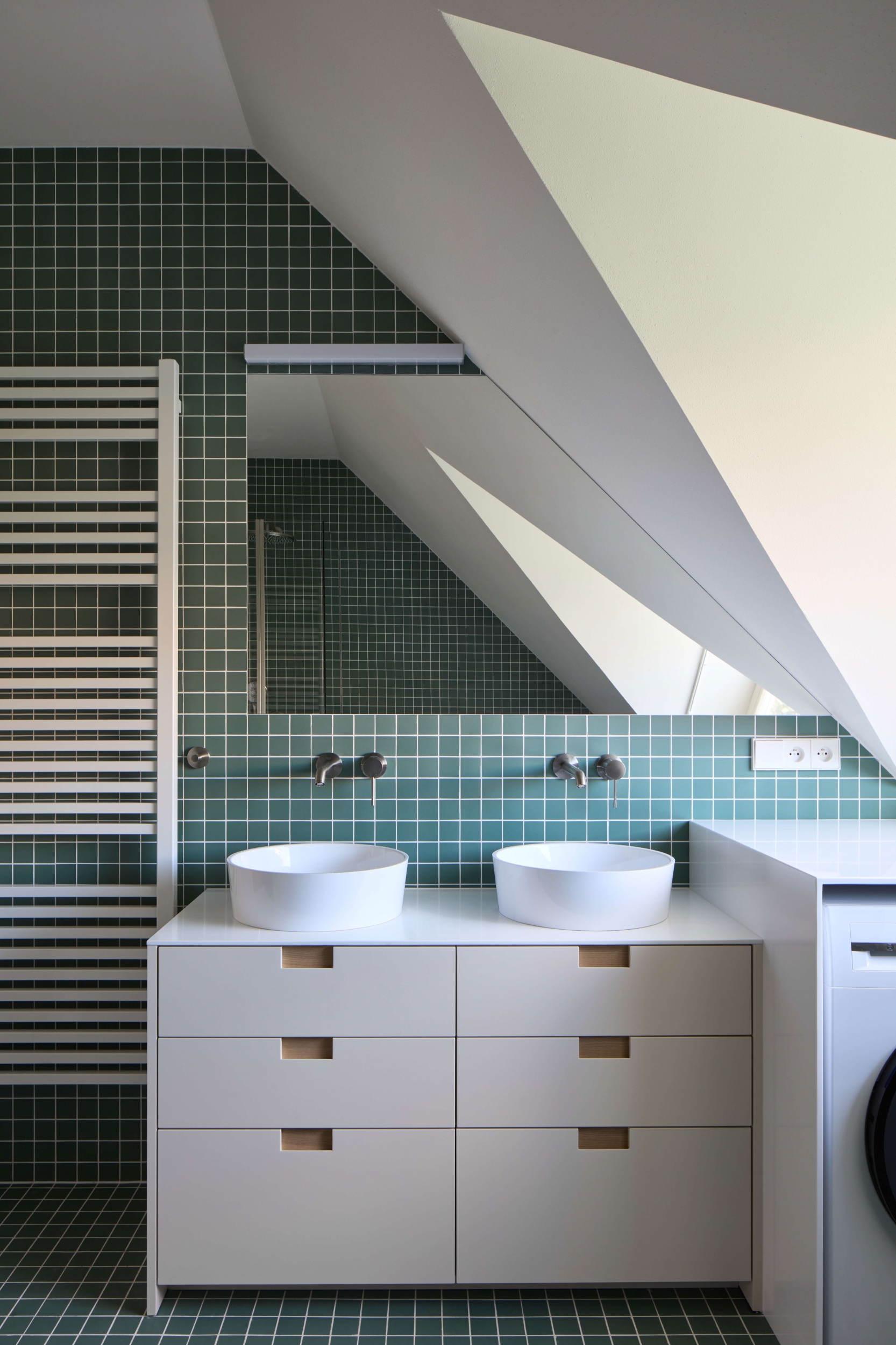 Vytápění a ohřev vody zajišťuje především tepelné čerpadlo, pro které byly pod garáží realizovány dva 200 metrů hluboké vrty. Plynový kondenzační kotel slouží jako sekundární zdroj tepla, který pokrývá pouze špičkové potřeby. Důraz je kladen na udržitelnost a hospodaření s dešťovou vodou. Dešťová voda ze střechy je shromažďována v akumulační a retenční nádrži a následně využívána pro zálivku zahrady, čímž se omezuje zatížení kanalizační sítě. Zelená střecha garáže a nová výsadba jsou navrženy tak, aby doplňovaly a zlepšovaly ekologickou funkci pozemku.